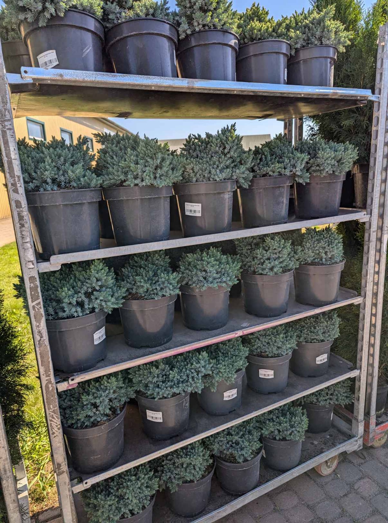40 centimeters high and 1-1.5 meters wide. The shoots are dense and short. At a young age, it has a spherical crown, at an older age it has a hemispherical crown. The plant is often compared to a blue star spread out on the ground.